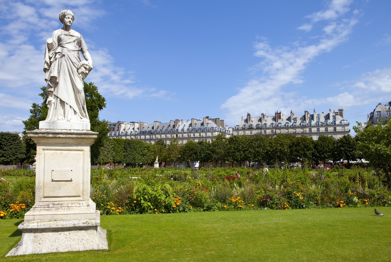 Marmorskulptur im Tuileriengarten vor blühenden Beeten und Haussmann-Dächern unter blauem Himmel.
